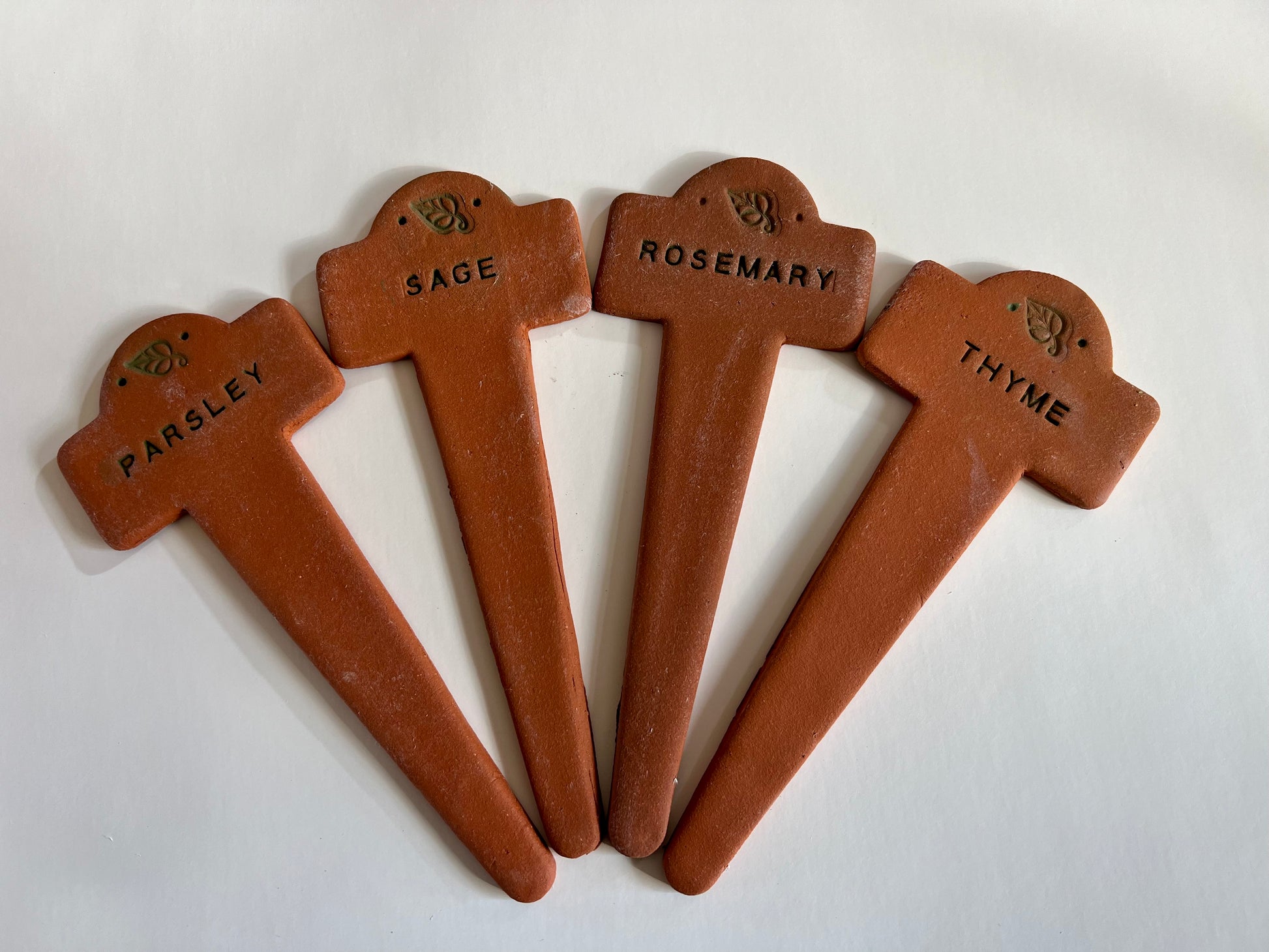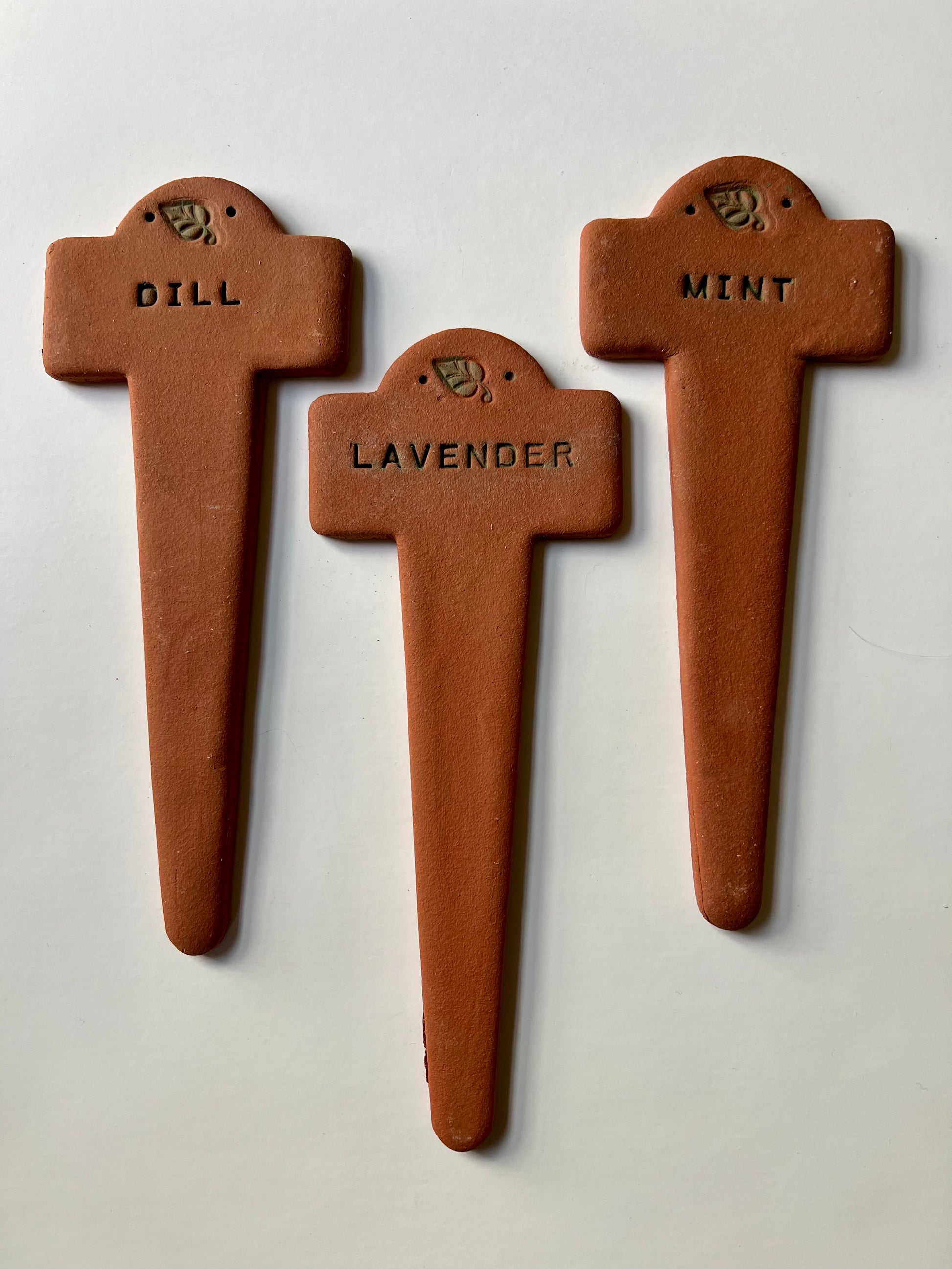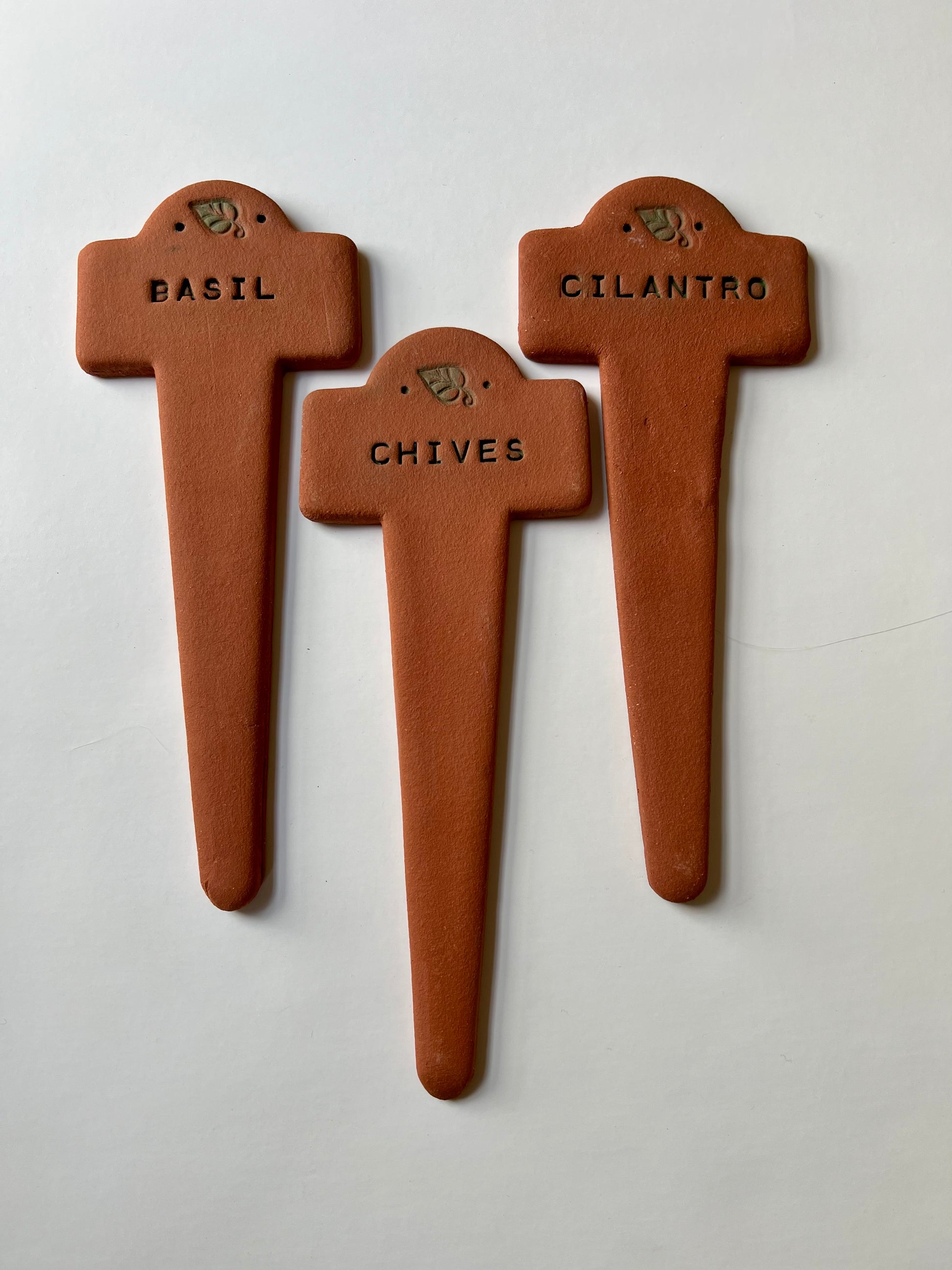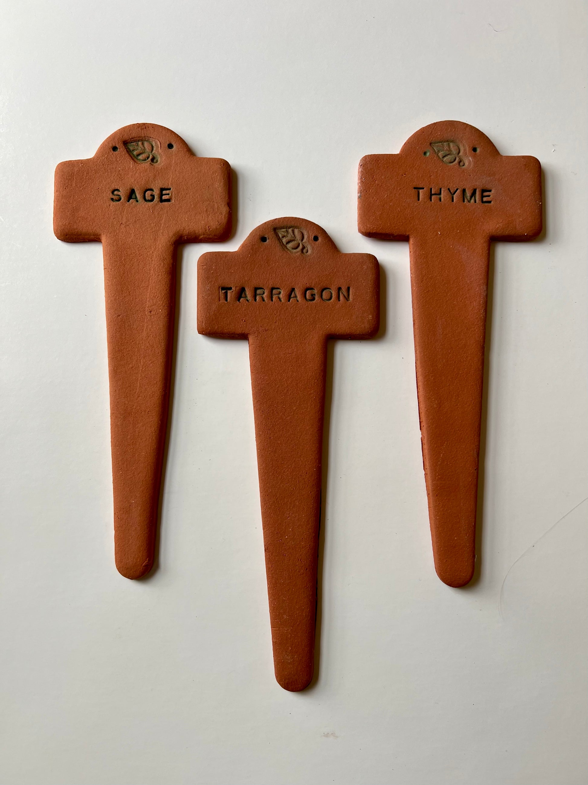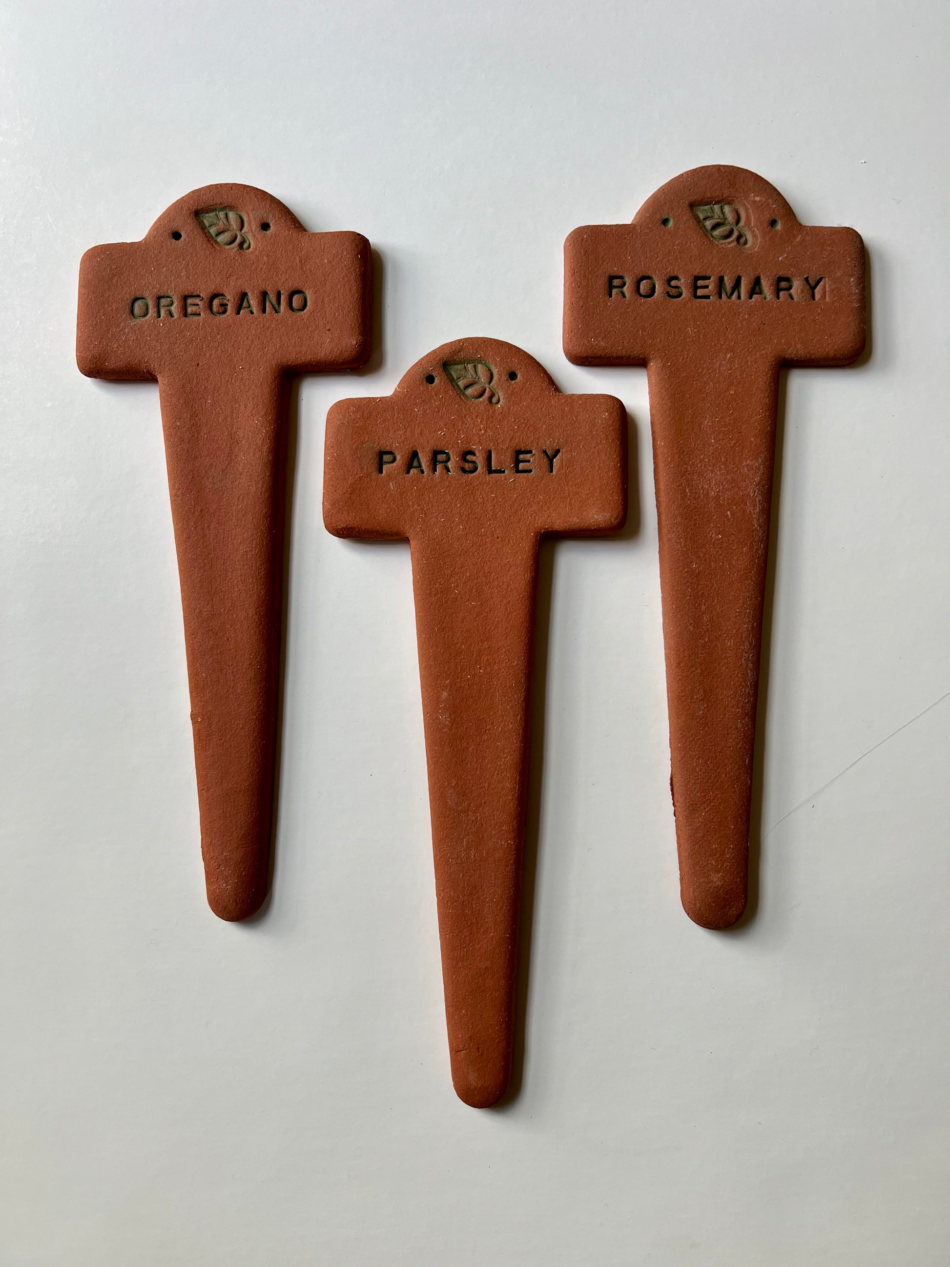 These handmade terracotta markers never fade and will dress up your potager nicely. Made of a sturdy sculptural clay that lasts for years, they will also withstand chilly winter temperatures. Additional plant names available upon request. 9.25t x 3.75w.